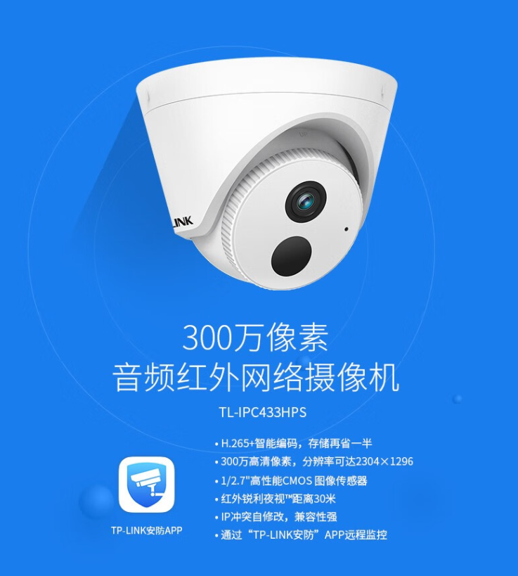 監(jiān)控?cái)z像機(jī)普聯(lián)/TP-LINK300萬(wàn) DC供電智能網(wǎng)絡(luò)攝像頭高清夜視遠(yuǎn)程監(jiān)控TL-IPC433HS/臺(tái)